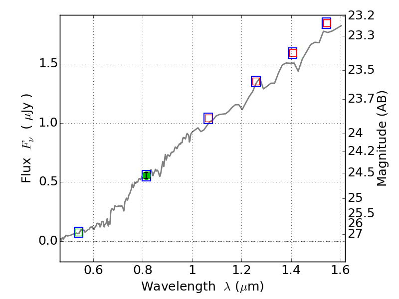 Object #913 x,y = (4454, 4293) RA, Dec = (02:57:02.856, -23:24:39.24) = (44.26190, -23.41090) BPZ = 0.677 [0.166--3.897] type = 2.00 (Ell6_A_0) chisq2 = 0.00 ODDS = 0.09 z_cluster = 0.505