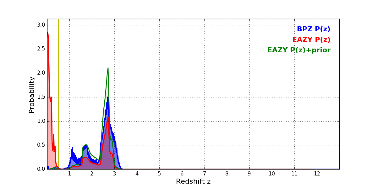 In P(z) plots: Yellow lines mark the cluster redshift z = 0.505,