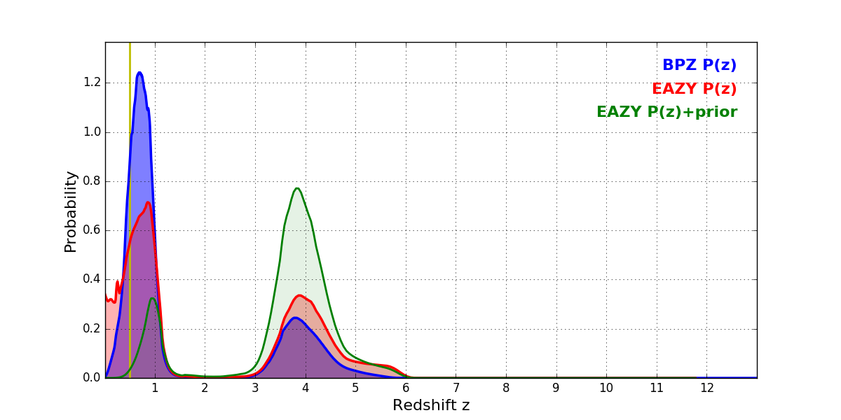 In P(z) plots: Yellow lines mark the cluster redshift z = 0.505,