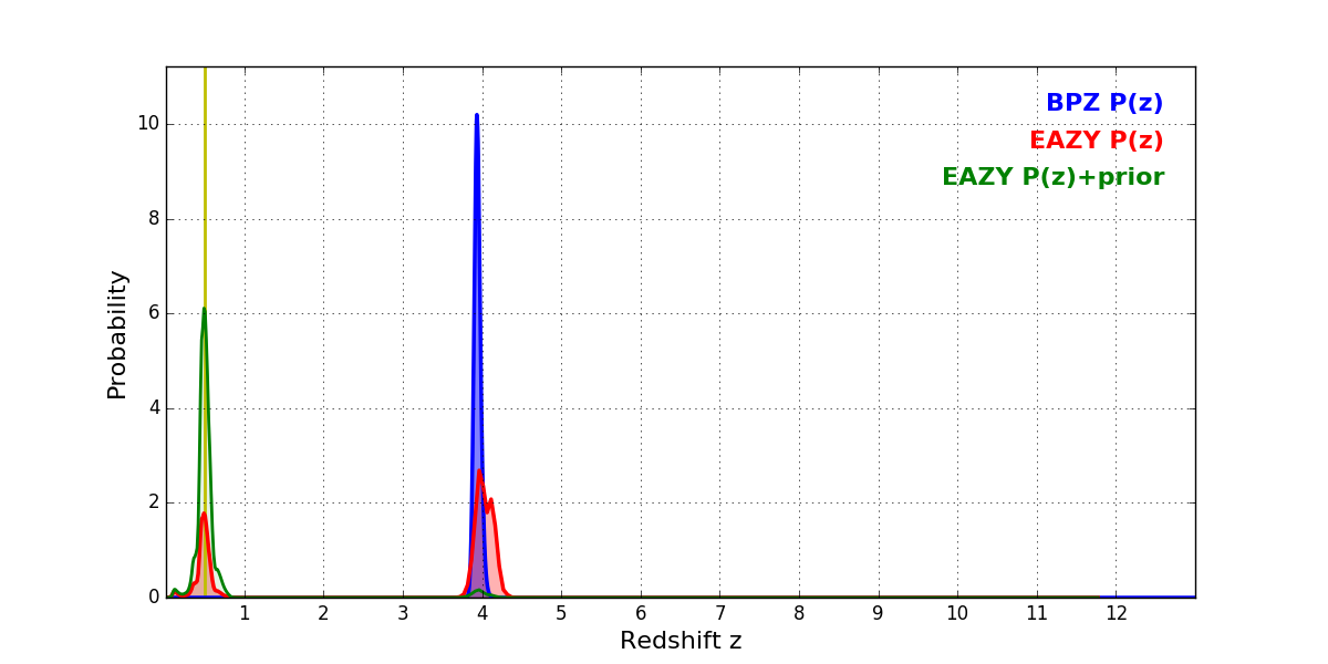 In P(z) plots: Yellow lines mark the cluster redshift z = 0.505,