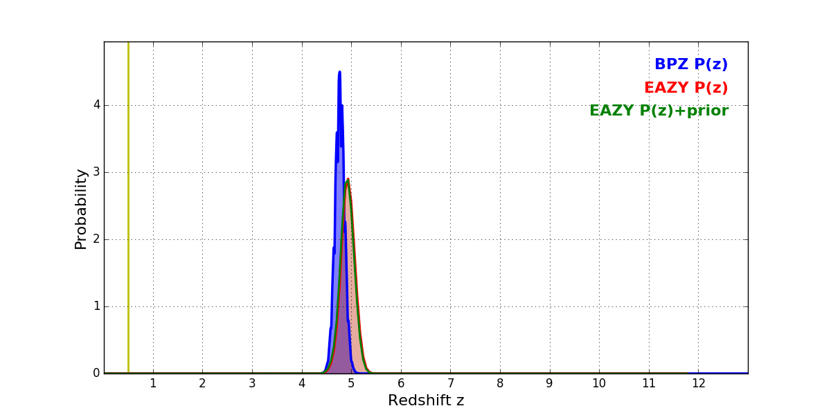 In P(z) plots: Yellow lines mark the cluster redshift z = 0.505,
