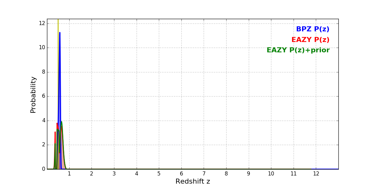 In P(z) plots: Yellow lines mark the cluster redshift z = 0.505,