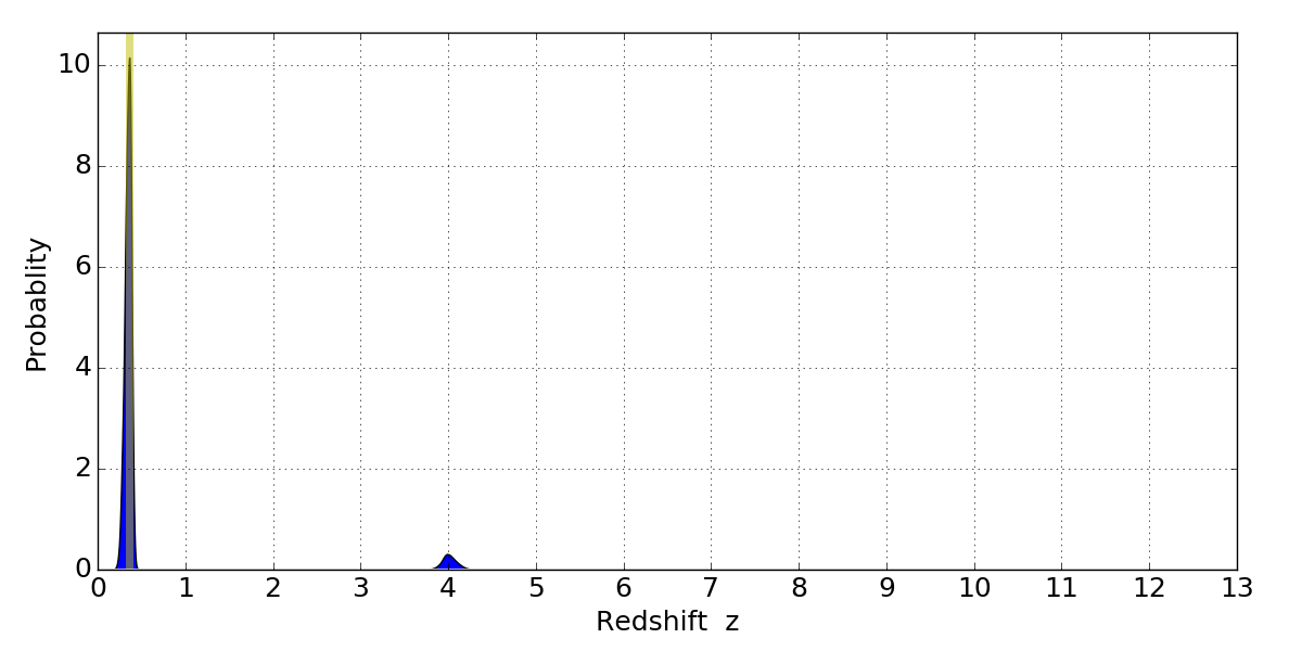 In P(z) plots: Yellow lines mark the cluster redshift z = 0.356,