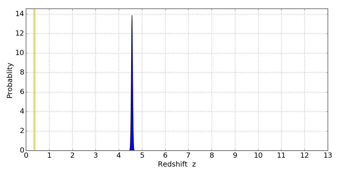 In P(z) plots: Yellow lines mark the cluster redshift z = 0.356,