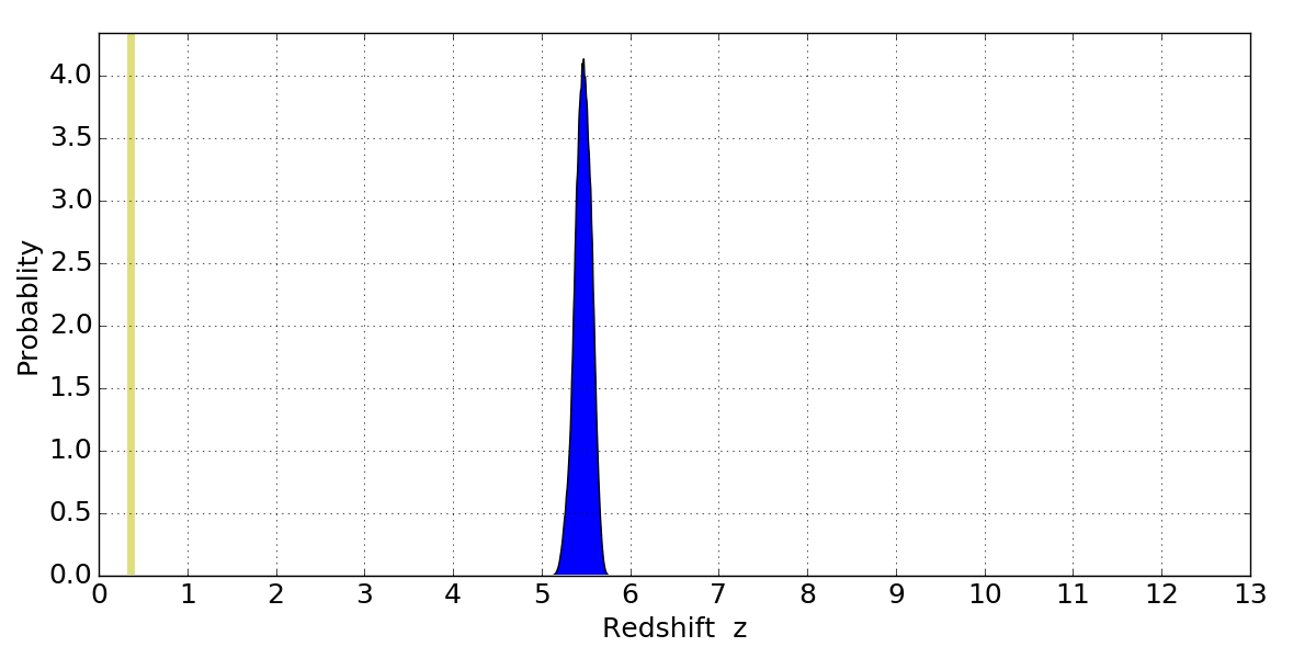 In P(z) plots: Yellow lines mark the cluster redshift z = 0.356,