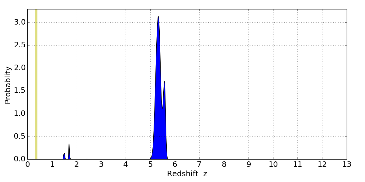 In P(z) plots: Yellow lines mark the cluster redshift z = 0.356,