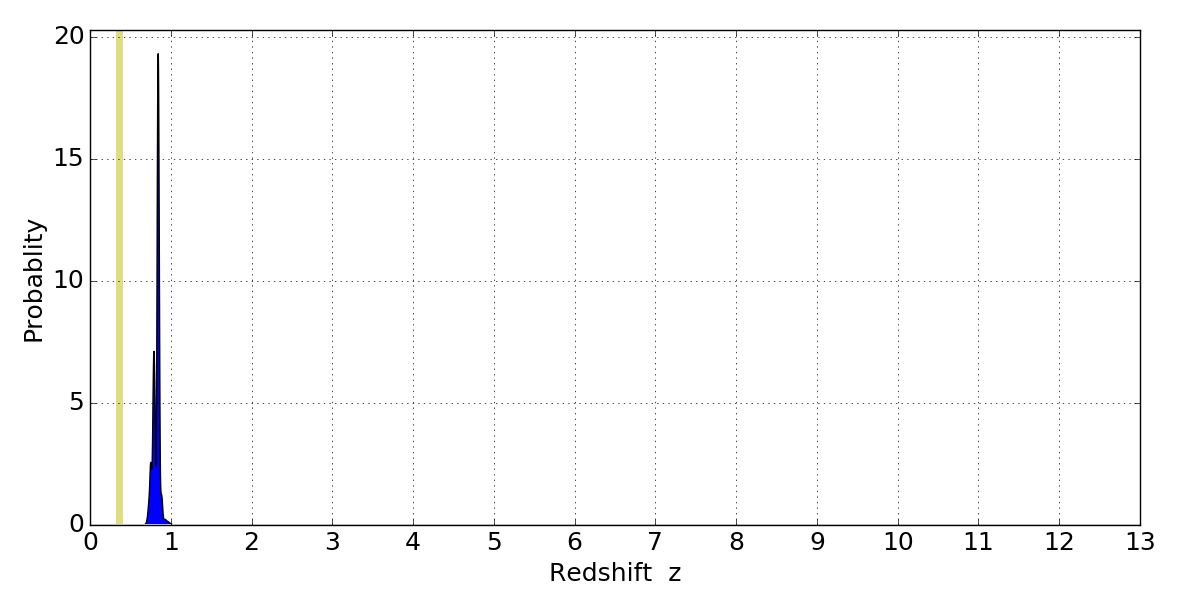 In P(z) plots: Yellow lines mark the cluster redshift z = 0.356,