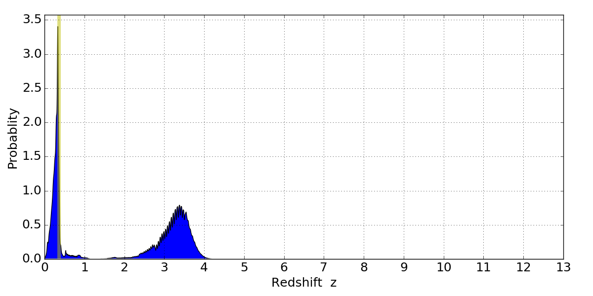 In P(z) plots: Yellow lines mark the cluster redshift z = 0.356,