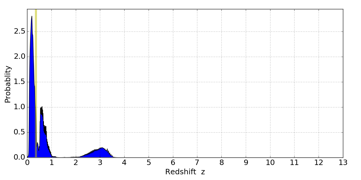 In P(z) plots: Yellow lines mark the cluster redshift z = 0.356,