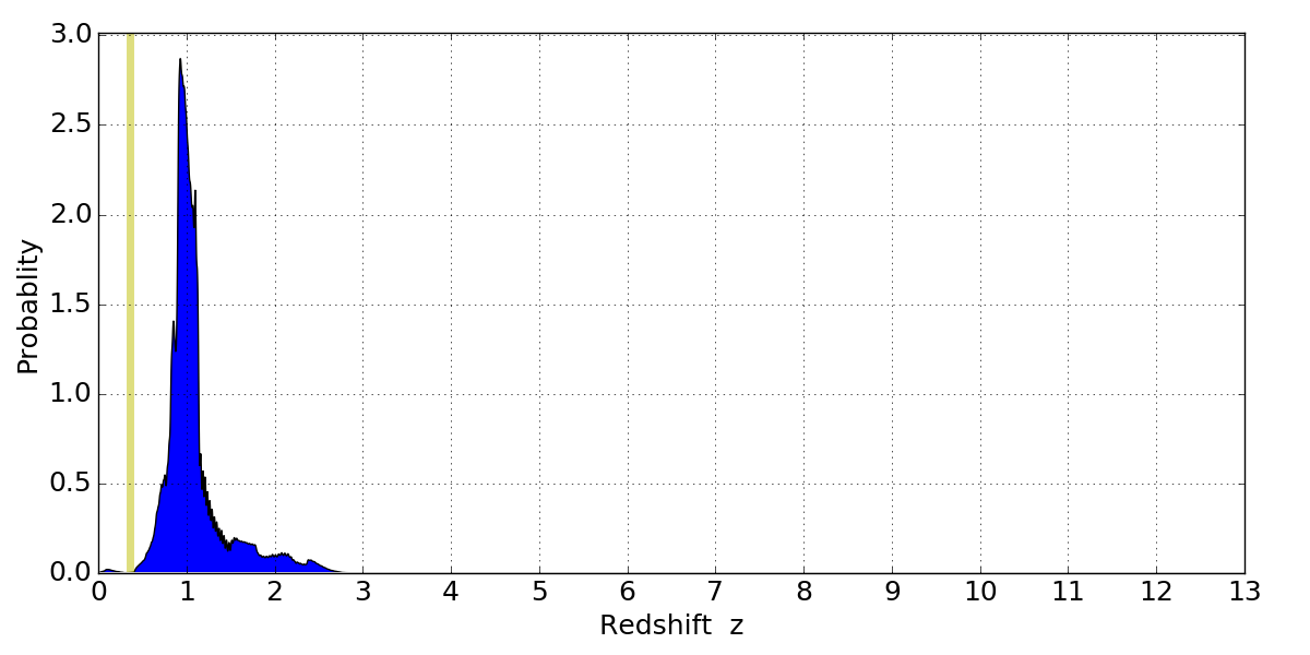 In P(z) plots: Yellow lines mark the cluster redshift z = 0.356,