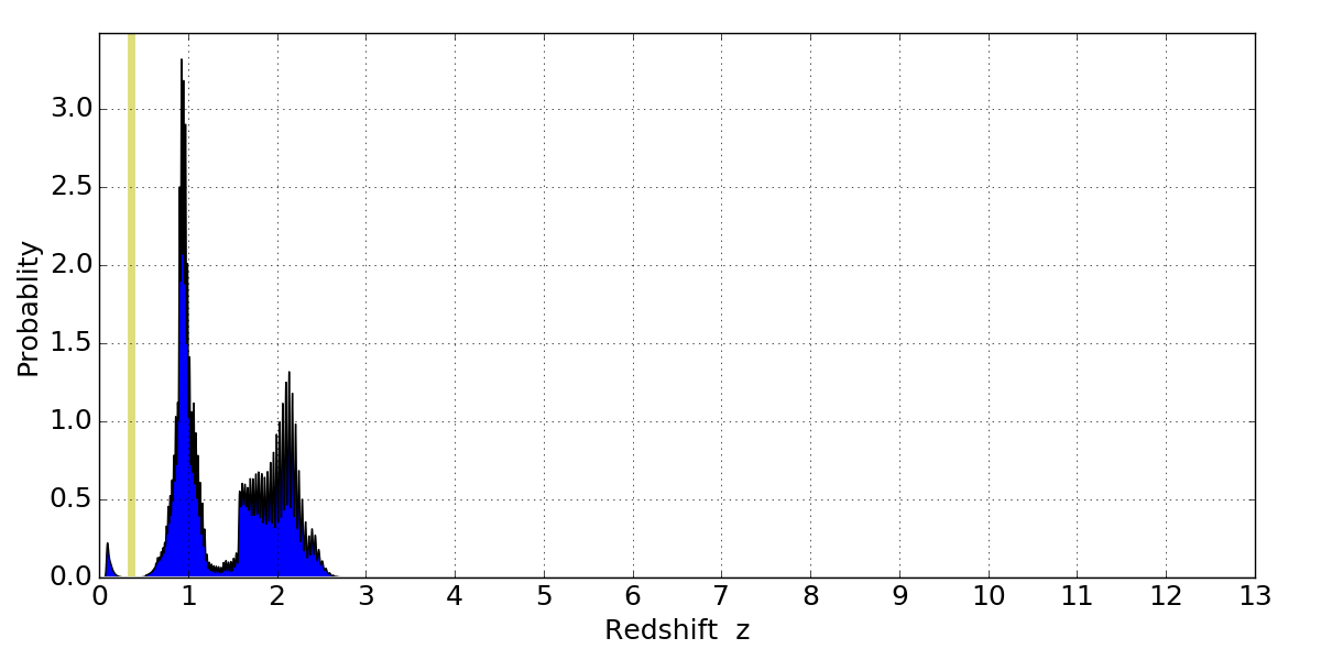 In P(z) plots: Yellow lines mark the cluster redshift z = 0.356,