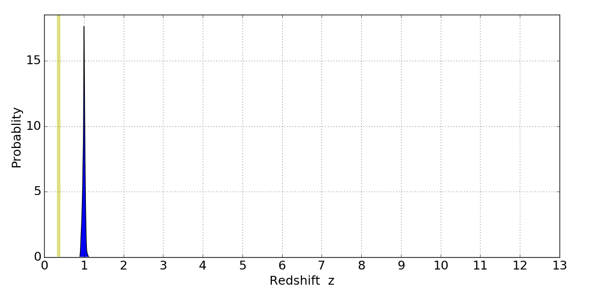 In P(z) plots: Yellow lines mark the cluster redshift z = 0.356,