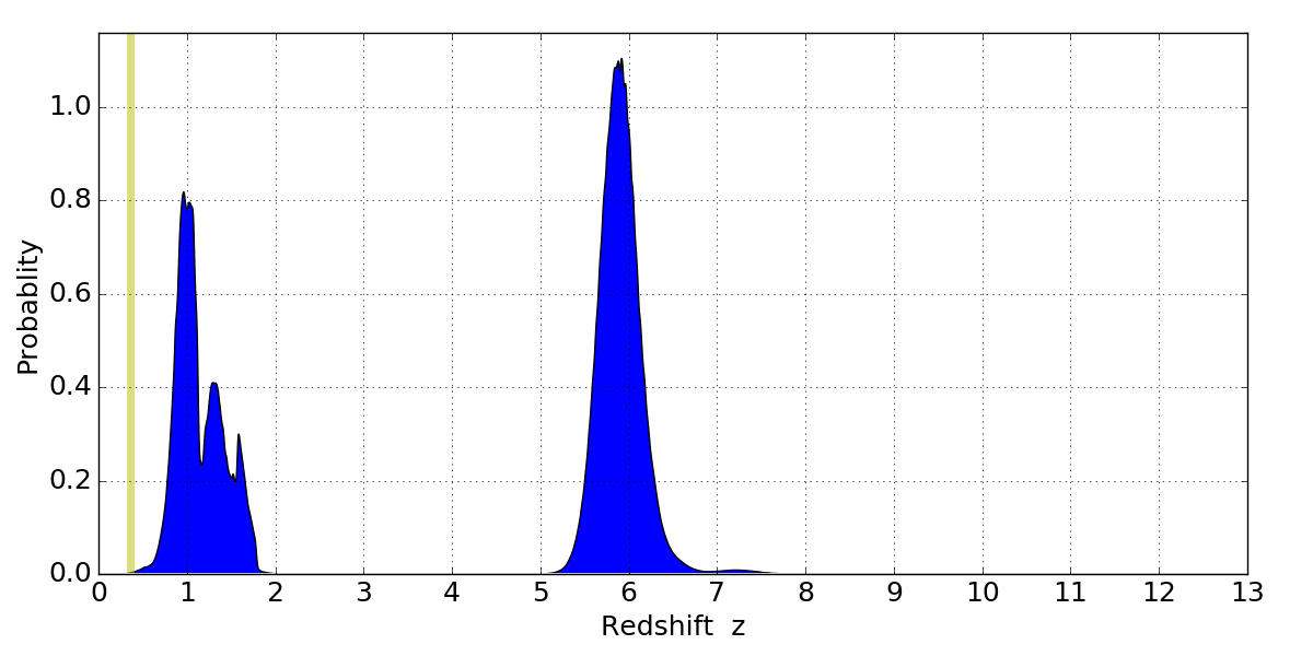 In P(z) plots: Yellow lines mark the cluster redshift z = 0.356,