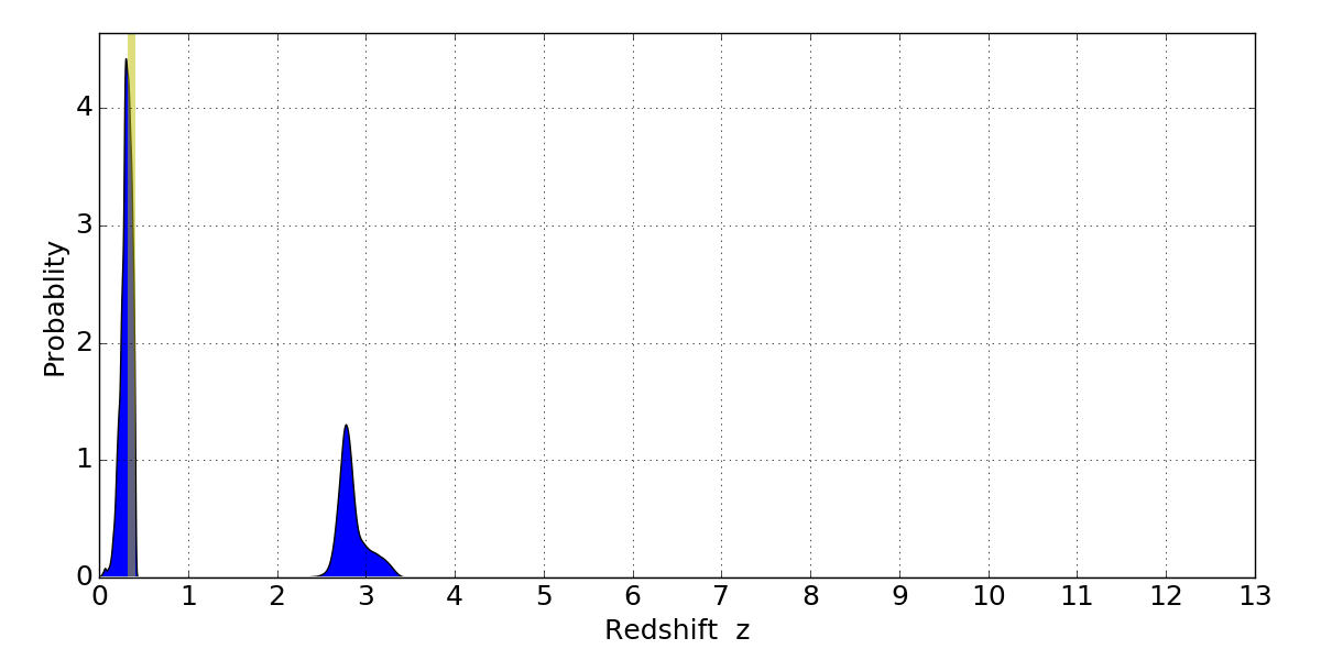 In P(z) plots: Yellow lines mark the cluster redshift z = 0.356,