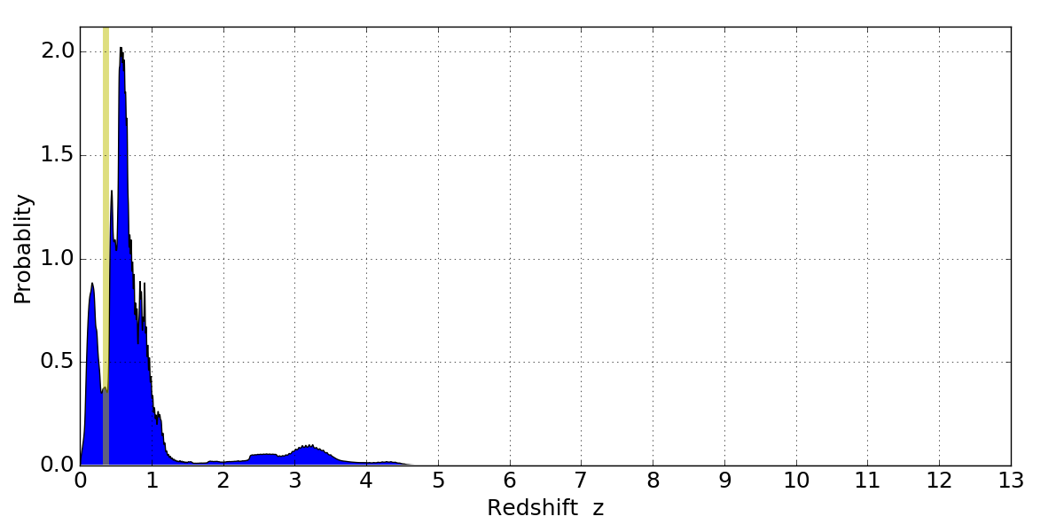 In P(z) plots: Yellow lines mark the cluster redshift z = 0.356,