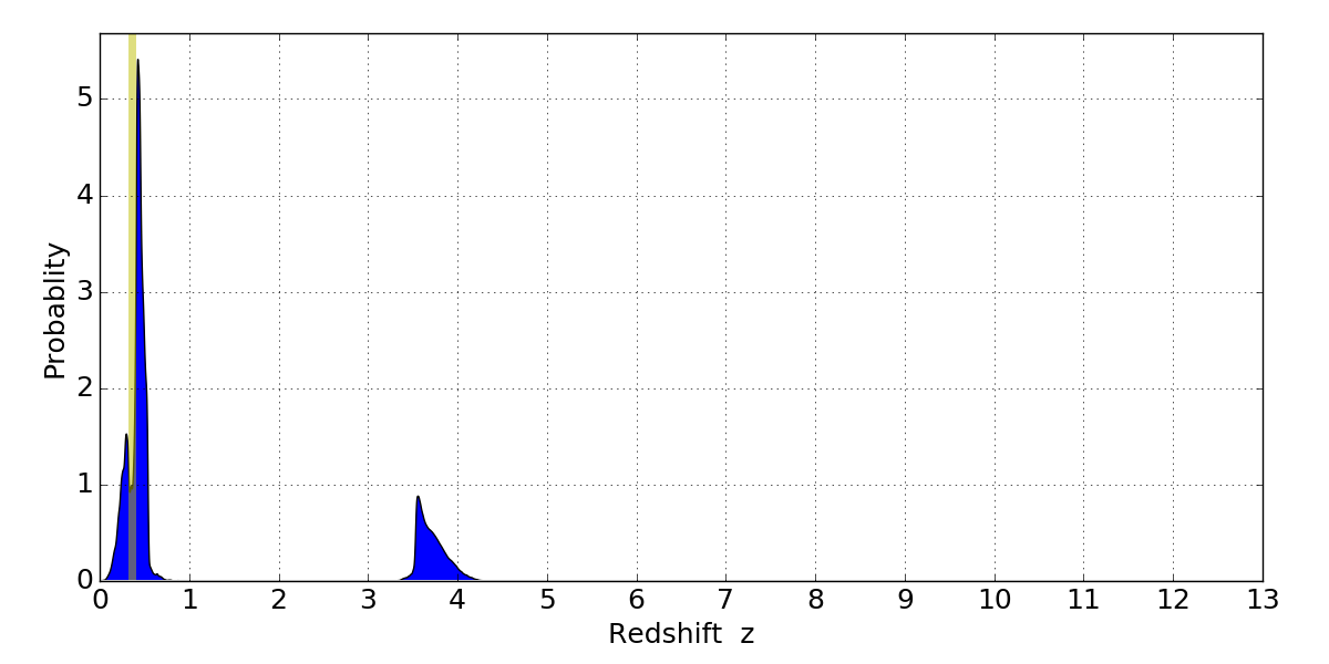 In P(z) plots: Yellow lines mark the cluster redshift z = 0.356,