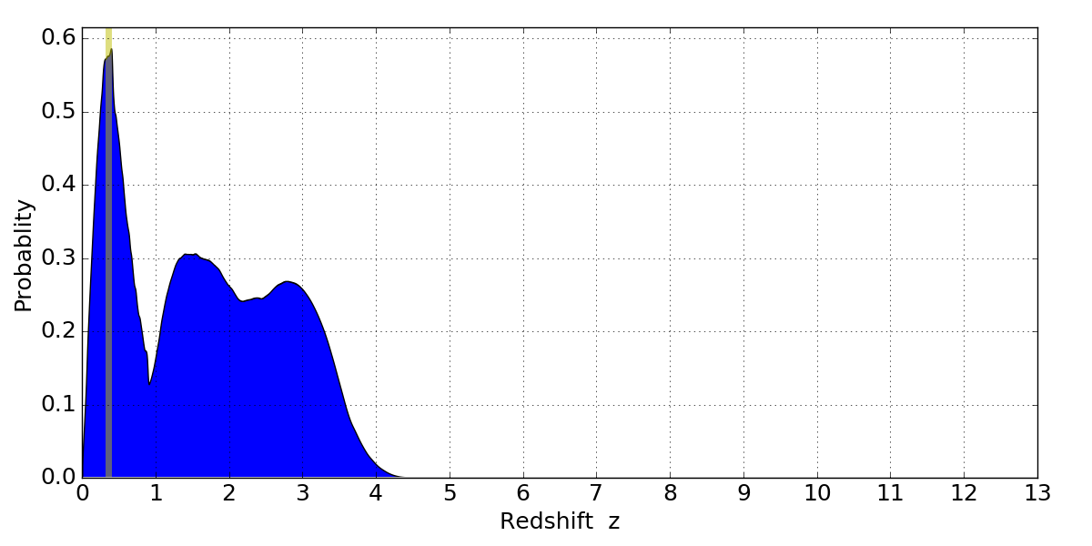 In P(z) plots: Yellow lines mark the cluster redshift z = 0.356,