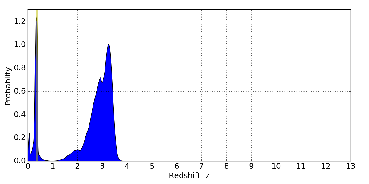 In P(z) plots: Yellow lines mark the cluster redshift z = 0.356,