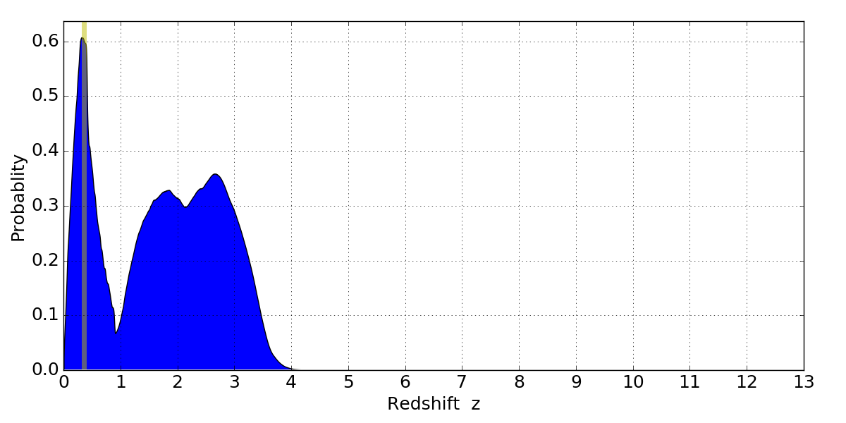 In P(z) plots: Yellow lines mark the cluster redshift z = 0.356,