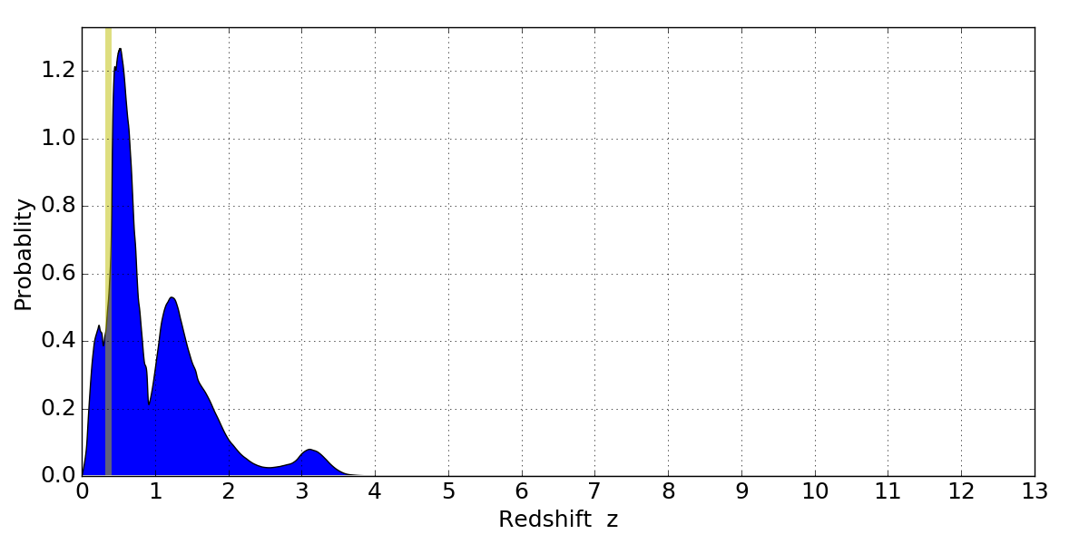 In P(z) plots: Yellow lines mark the cluster redshift z = 0.356,