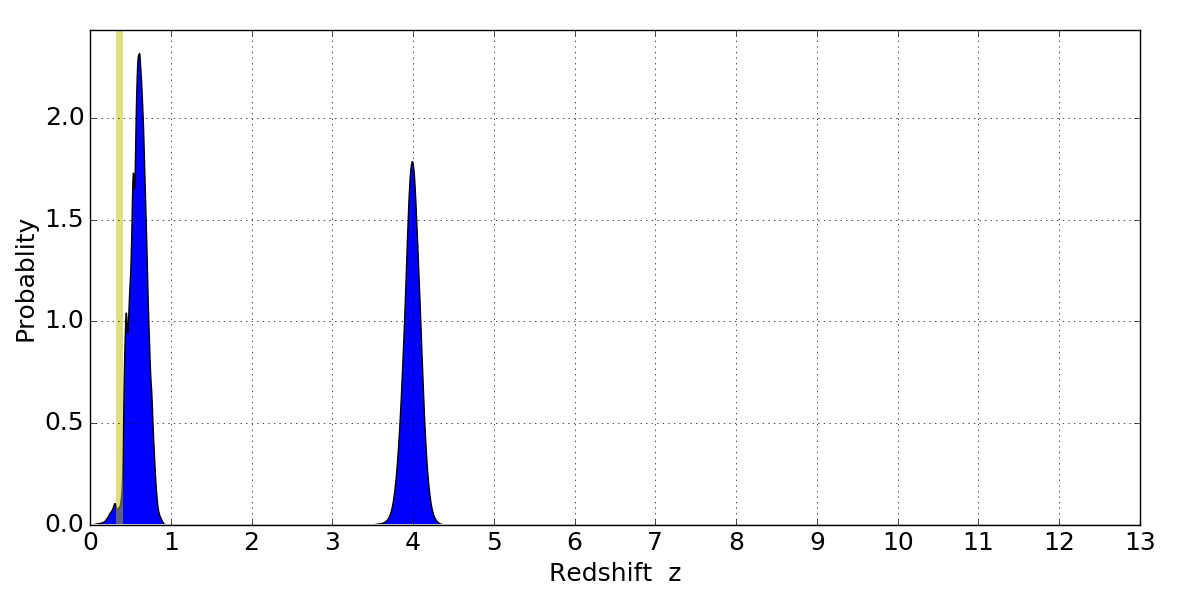 In P(z) plots: Yellow lines mark the cluster redshift z = 0.356,