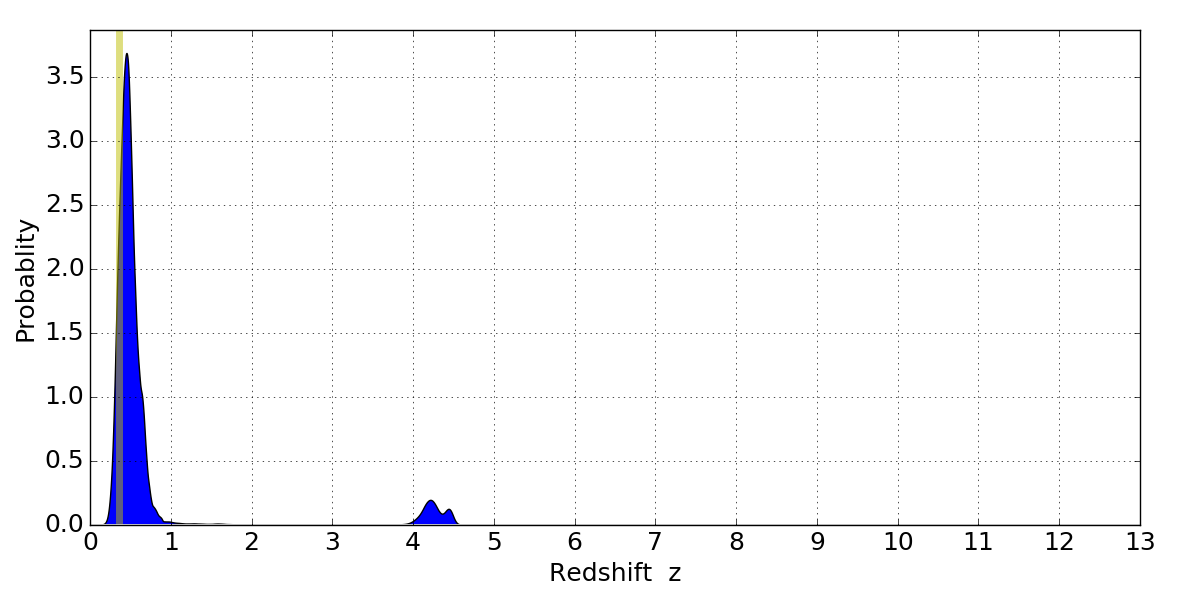 In P(z) plots: Yellow lines mark the cluster redshift z = 0.356,