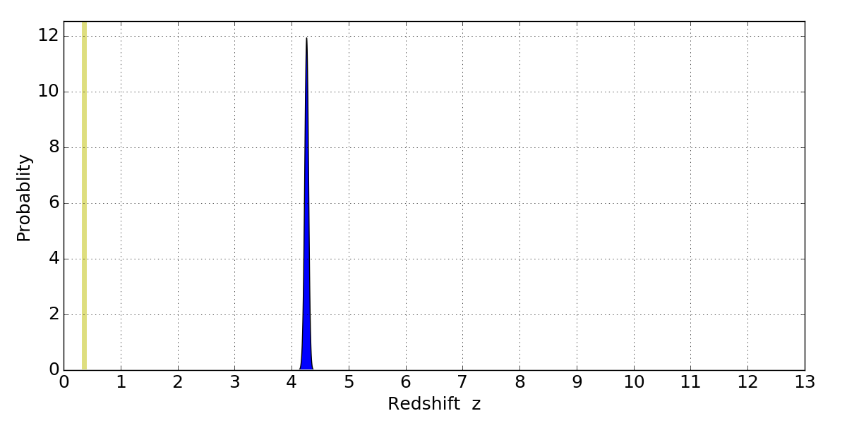 In P(z) plots: Yellow lines mark the cluster redshift z = 0.356,
