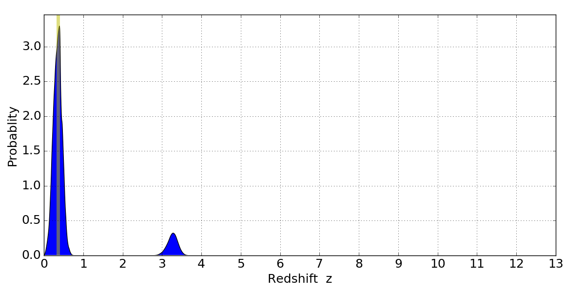 In P(z) plots: Yellow lines mark the cluster redshift z = 0.356,