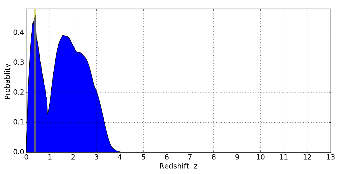 In P(z) plots: Yellow lines mark the cluster redshift z = 0.356,