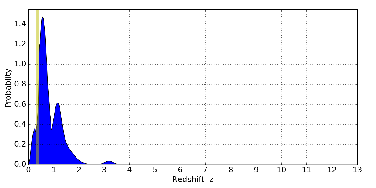 In P(z) plots: Yellow lines mark the cluster redshift z = 0.356,