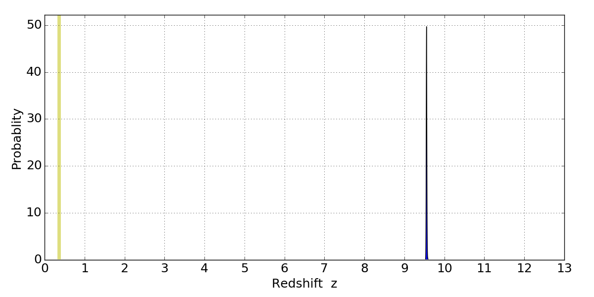 In P(z) plots: Yellow lines mark the cluster redshift z = 0.356,