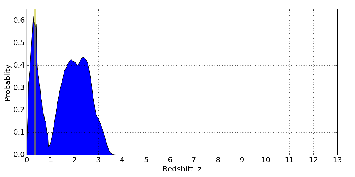 In P(z) plots: Yellow lines mark the cluster redshift z = 0.356,