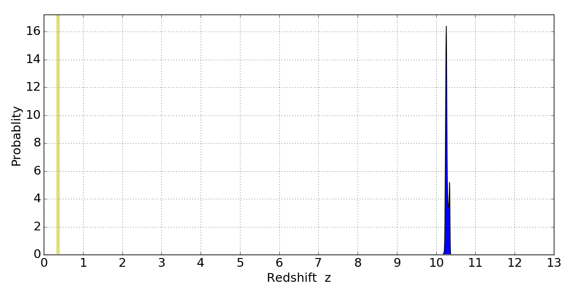 In P(z) plots: Yellow lines mark the cluster redshift z = 0.356,
