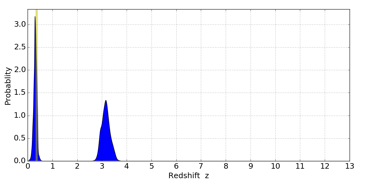 In P(z) plots: Yellow lines mark the cluster redshift z = 0.356,