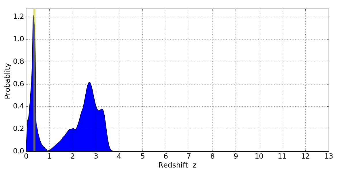 In P(z) plots: Yellow lines mark the cluster redshift z = 0.356,