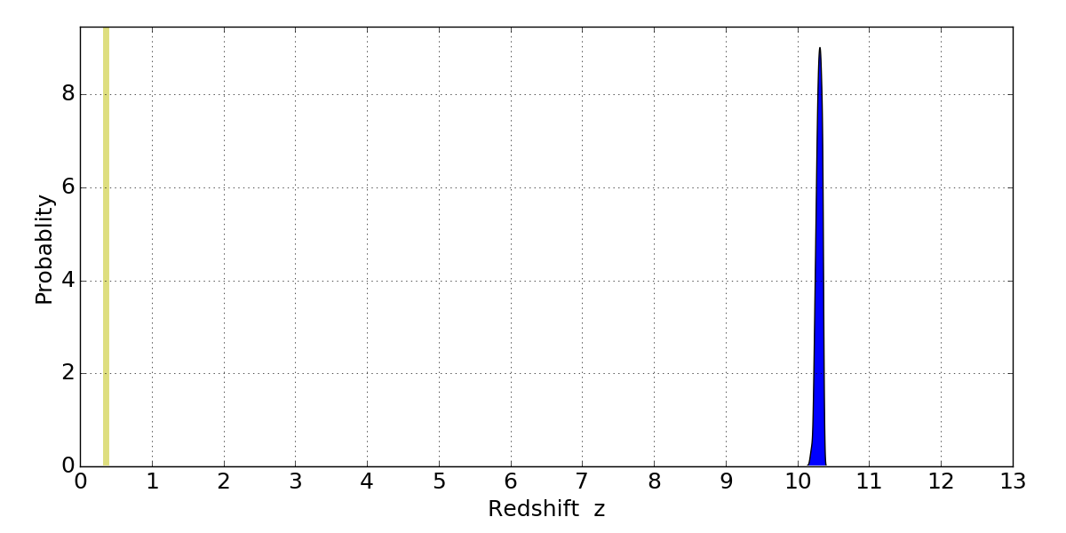 In P(z) plots: Yellow lines mark the cluster redshift z = 0.356,