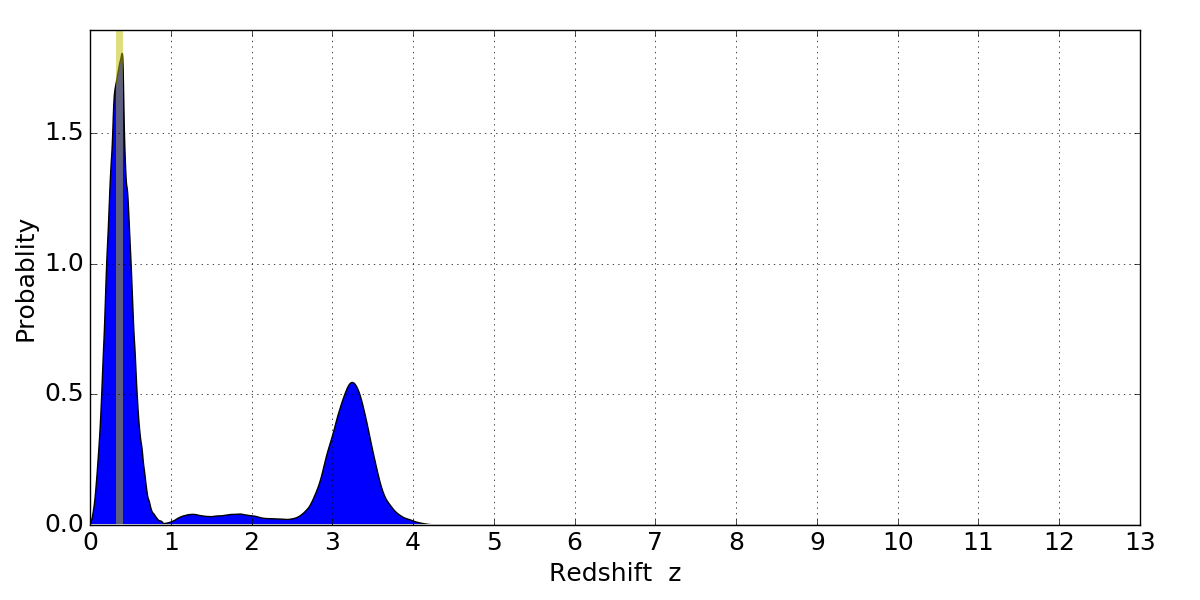 In P(z) plots: Yellow lines mark the cluster redshift z = 0.356,