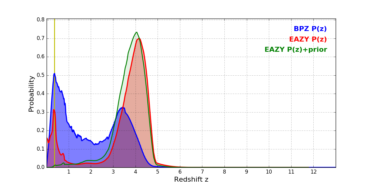In P(z) plots: Yellow lines mark the cluster redshift z = 0.356,