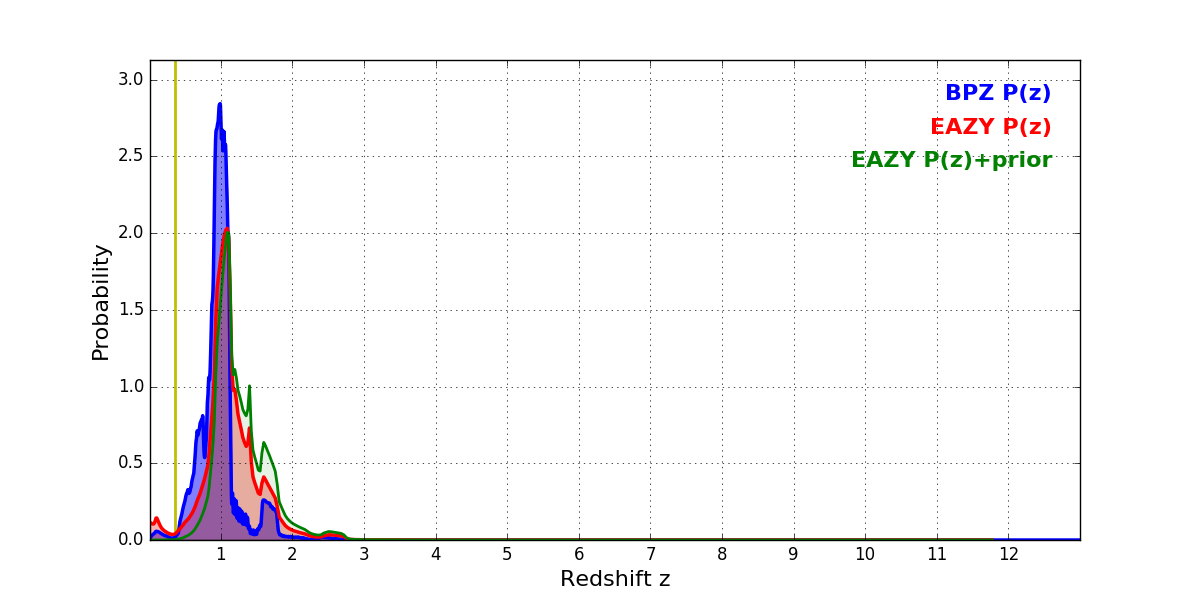 In P(z) plots: Yellow lines mark the cluster redshift z = 0.356,