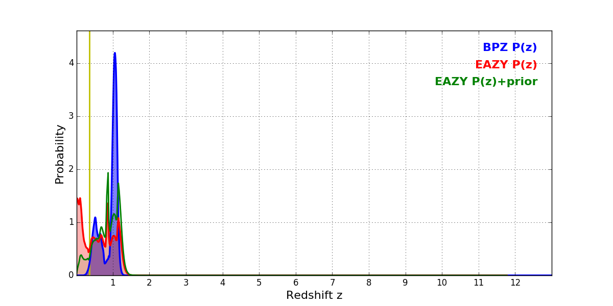 In P(z) plots: Yellow lines mark the cluster redshift z = 0.356,
