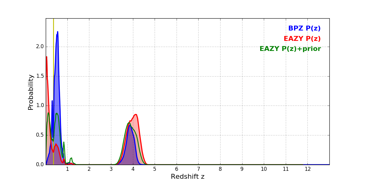 In P(z) plots: Yellow lines mark the cluster redshift z = 0.356,