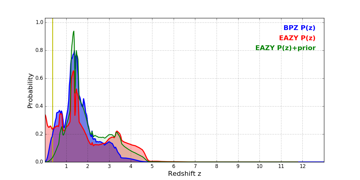 In P(z) plots: Yellow lines mark the cluster redshift z = 0.356,