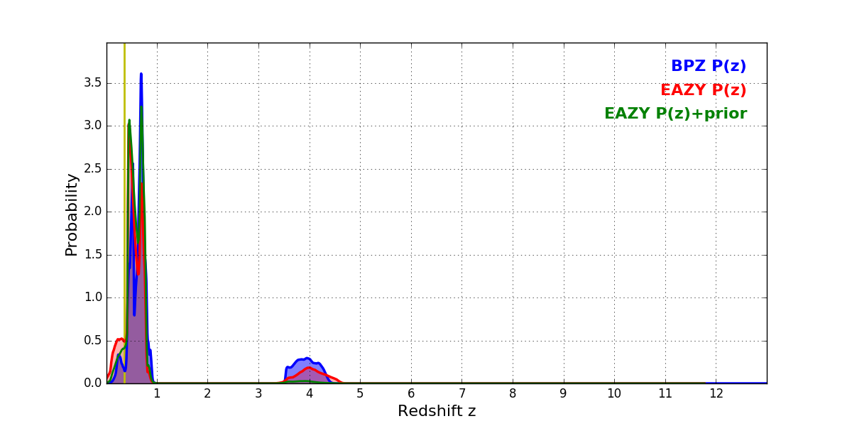 In P(z) plots: Yellow lines mark the cluster redshift z = 0.356,