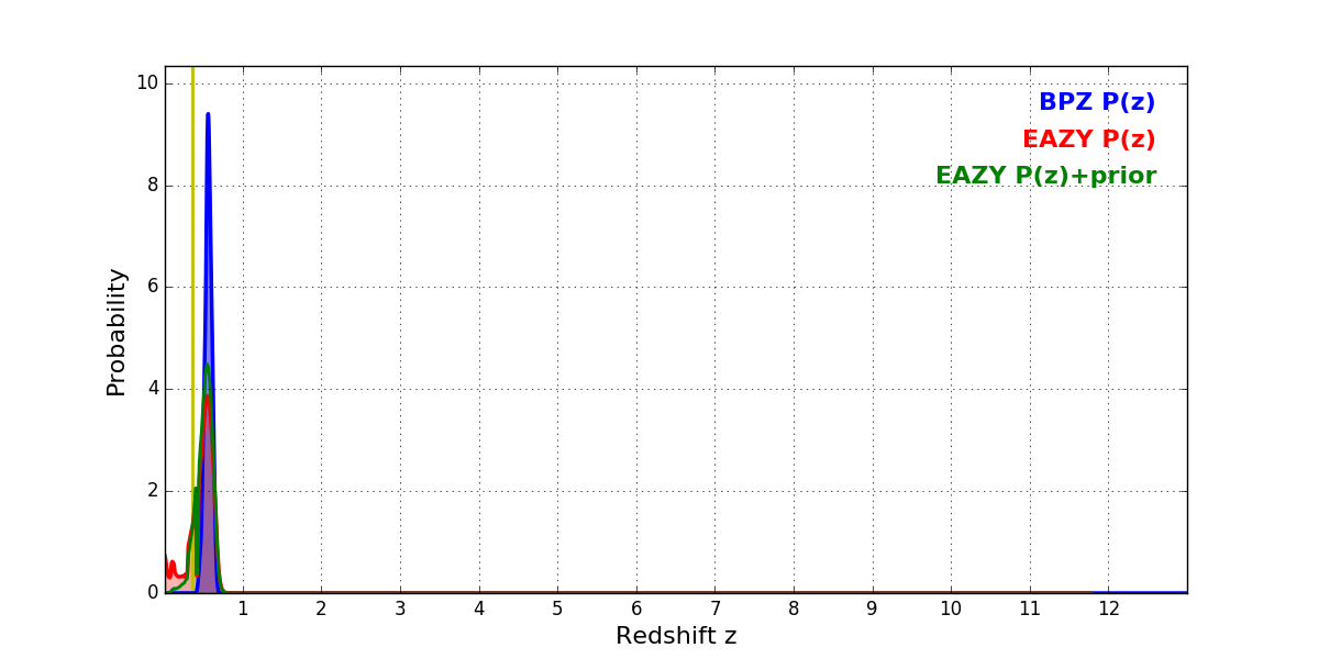 In P(z) plots: Yellow lines mark the cluster redshift z = 0.356,