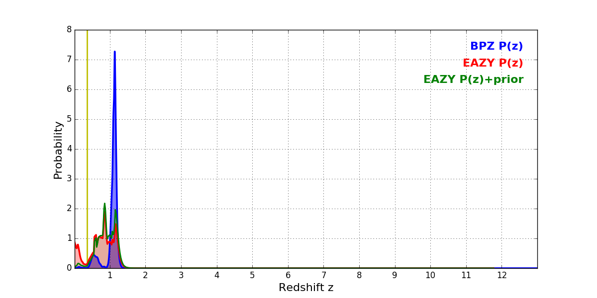 In P(z) plots: Yellow lines mark the cluster redshift z = 0.356,