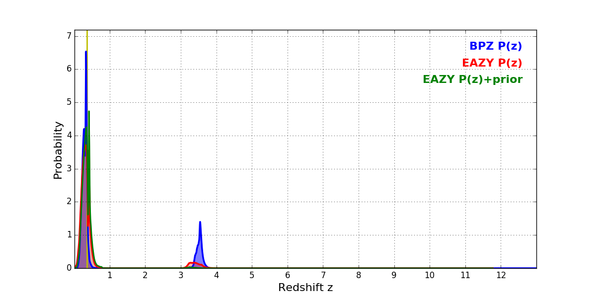 In P(z) plots: Yellow lines mark the cluster redshift z = 0.356,