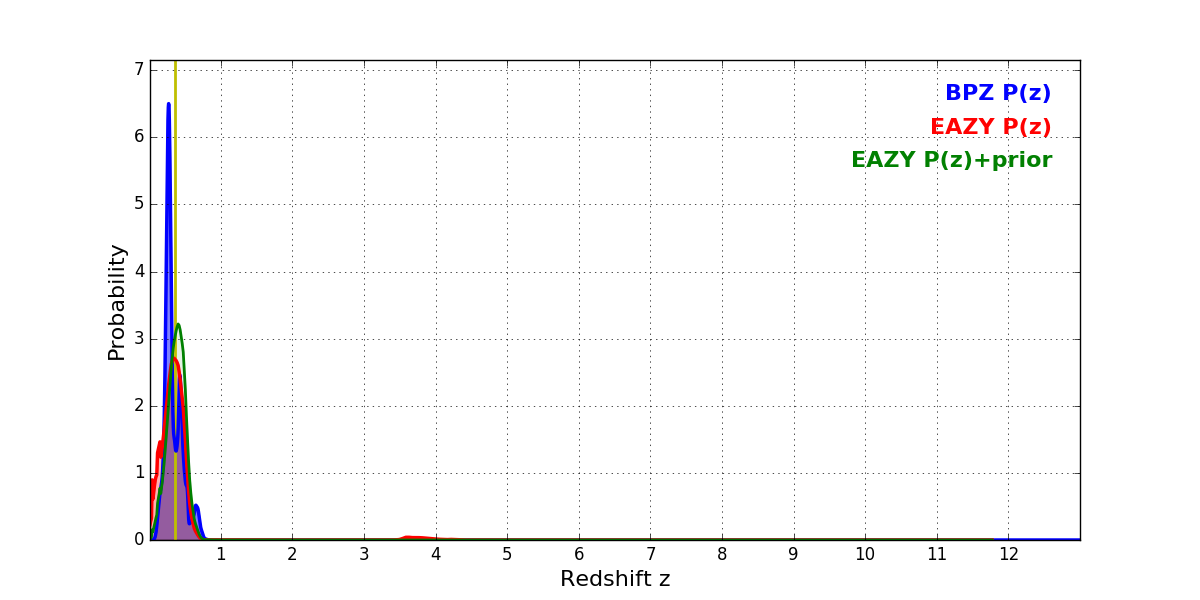 In P(z) plots: Yellow lines mark the cluster redshift z = 0.356,