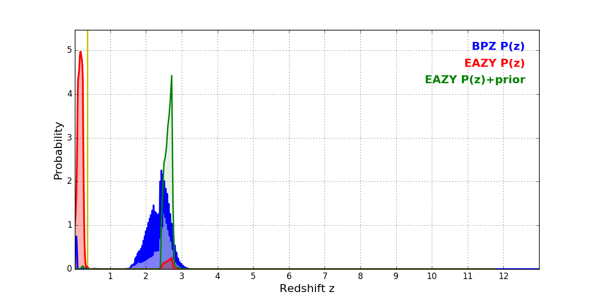 In P(z) plots: Yellow lines mark the cluster redshift z = 0.356,