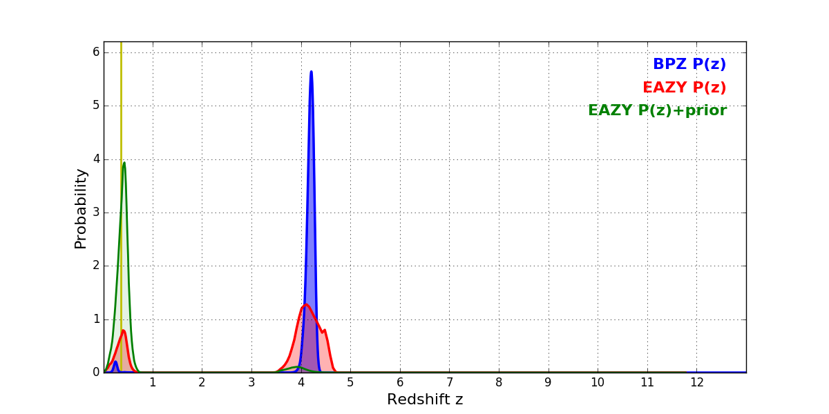 In P(z) plots: Yellow lines mark the cluster redshift z = 0.356,