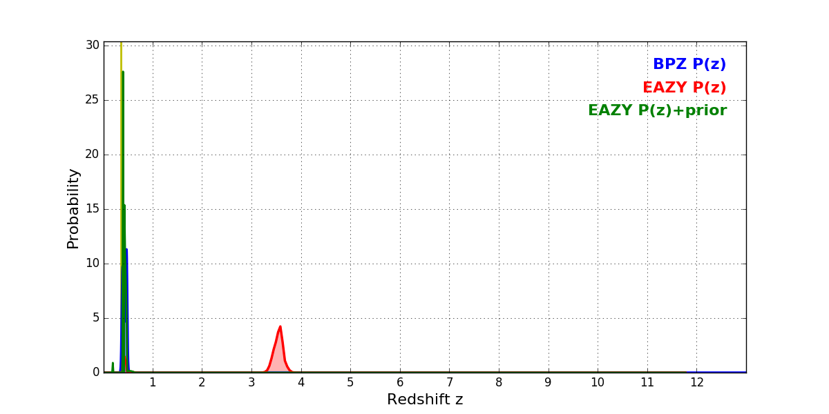In P(z) plots: Yellow lines mark the cluster redshift z = 0.356,